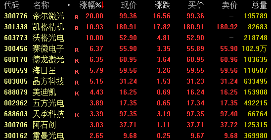 玻璃基板概念盘中强势拉升,截至收盘,帝尔激光20%涨停,凯格精机涨超10%,沃格光电涨停,赛微电子、德龙激光涨超6%。