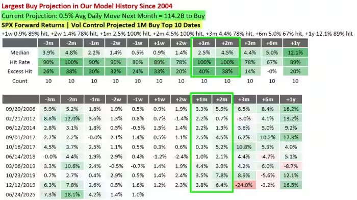 McElligott也指出,以史为鉴,当上述模型预示着系统交易者的购买将会激增时,市场往往会迎来强劲回报,特别是在接下来的一两个月内。如下图所示:该模型预测短期内上涨的准确率高达100%,并且还能预测强劲的超额回报。
