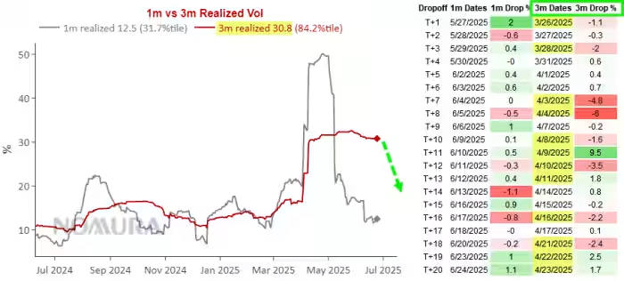 McElligott指出,许多这类基金都将已实现波动率(Realized volatility)作为决定其在特定时间点愿意在股票上投入多少资金的关键因素。而该模型最新输出的结果很大程度上受到三个月已实现波动率即将下降的影响。