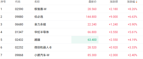 今日港股市场热点持续扩大,从此前互联网和科技,扩散至机器人。截至发稿,极智嘉-W(02590.HK)、优必选(09880.HK)、金力永磁(06680.HK)分别上涨8.26%、6.63%、5.90%。