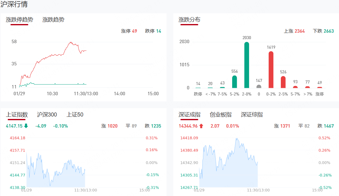 三大指数盘中集体翻绿,沪指窄幅震荡,创业板指冲高回落,科创50指数跌超1%。沪深两市半日成交额2.02万亿,较上个交易日放量1039亿。盘面上热点快速轮动,全市场超2800只个股下跌。从板块来看,贵金属概念反复活跃,西部黄金7天4板,中国黄金5连板,湖南黄金4连板。油气股延续强势,通源石油涨超10%。AI应用概念表现活跃,浙文互联8天4板,因赛集团、粤传媒涨停。银行板块持续走高,青岛银行涨停。房地产板块震荡反弹,大悦城、三湘印象、我爱我家涨停。下跌方面,半导体产业链走势较弱,北京君正、神工股份跌超6%。