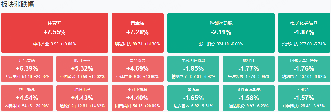 板块方面,贵金属、AI应用、房地产、足球体育等板块表现活跃,半导体产业链、电气设备等板块表现落后。截至收盘,沪指跌0.1%,深成指涨0.01%,创业板指跌0.05%。