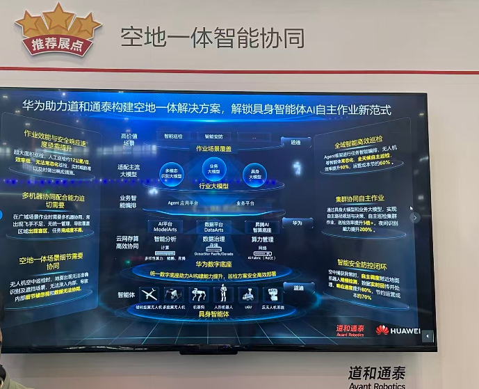在道和通泰展台,《科创板日报》记者看到华为与该公司合作构建的空地一体解决方案。该方案基于智能体框架,实现任务智能编排,支撑无人机等开展常态化、全天候自主巡检。借助具身大模型与业务大模型,系统可自主完成路径规划与决策,实现集群化自主巡检作业。当空中巡检发现异常时,系统会自动调度附近的地面机器人进行精细化检测。