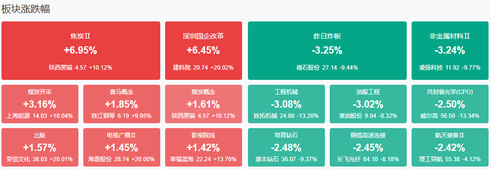 板块方面,深圳国企改革、煤炭、文化传媒等板块涨幅居前,工程机械、CPO、贵金属等板块跌幅居前。截至收盘,沪指跌0.66%,深成指跌0.87%,创业板指跌1.1%。