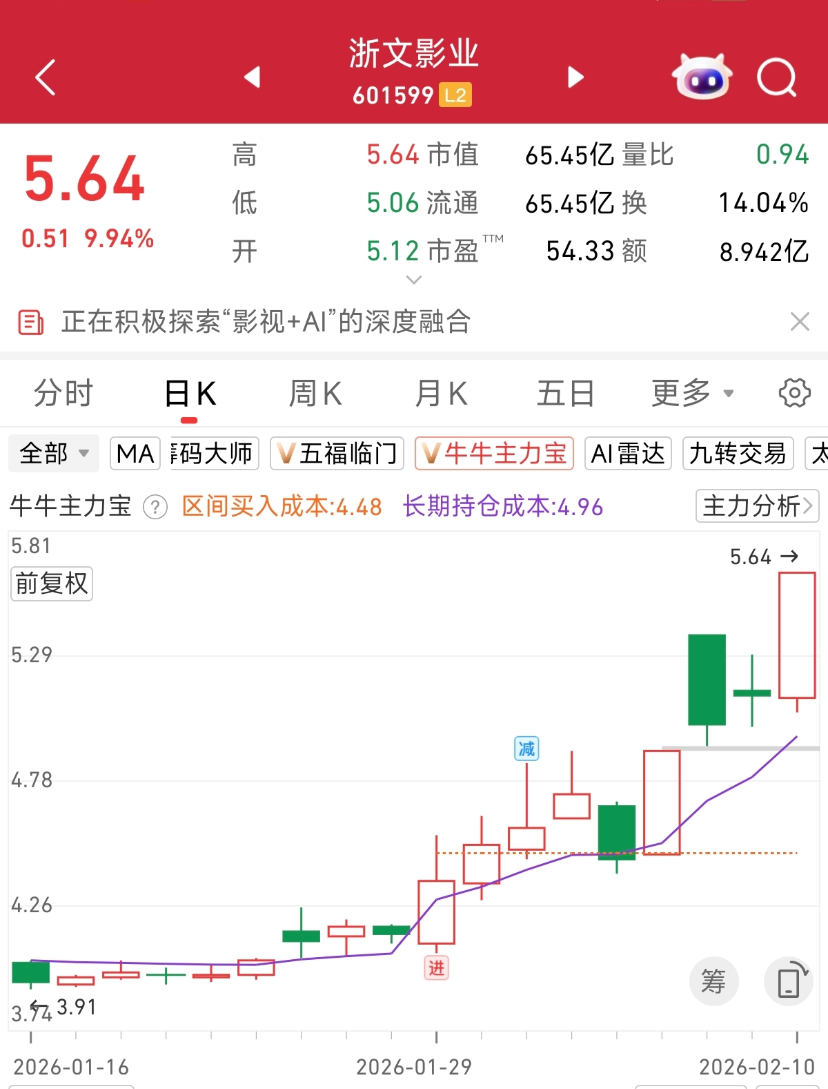 根据“主力宝”监控,近日表现亮眼的浙文影业,1月29日出现了主力进场信号,随,2月2日出现了一次减仓信号。