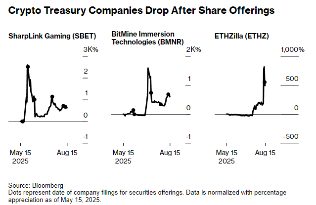 其他加密货币资产持仓企业同样难逃厄运。SharpLink Gaming(SBET.US)6月13日向美国证交会提交允许特定投资者出售股票的备案后,股价单日重挫72%。7月,BitMine Immersion Technologies(BMNR.US)申请发行20亿美元证券的备案直接引发40%的市值蒸发。